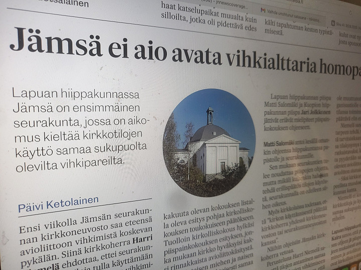 "Jämsä on Lapuan hiippakunnassa ensimmäinen seurakunta, jossa on aikomus kieltää samasukupuolisten parien vihkimiset kirkossa", uutisoi KSML 30.9. Sitten 2.10 aihe nousi jo lehden pääkirjoitukseen. Sen kärkikappaleessa todettiin Jämsässä "aiottavan linjata toisin kuin monissa muissa alueen seurakunnissa".