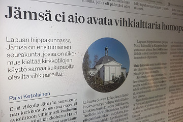 Keskisuomalainen nosti uutiseksi ja pääkirjoitusmaininnaksi "Jämsässä aiottavan kieltää samasukupuoliset vihkimiset kirkossa". Kirkkoneuvosto kuitenkin torjui äänin 7-3. KSML kertoi ratkaisun, mutta uutislavaste ehti luoda kuvaa asenteista kaupungissa.